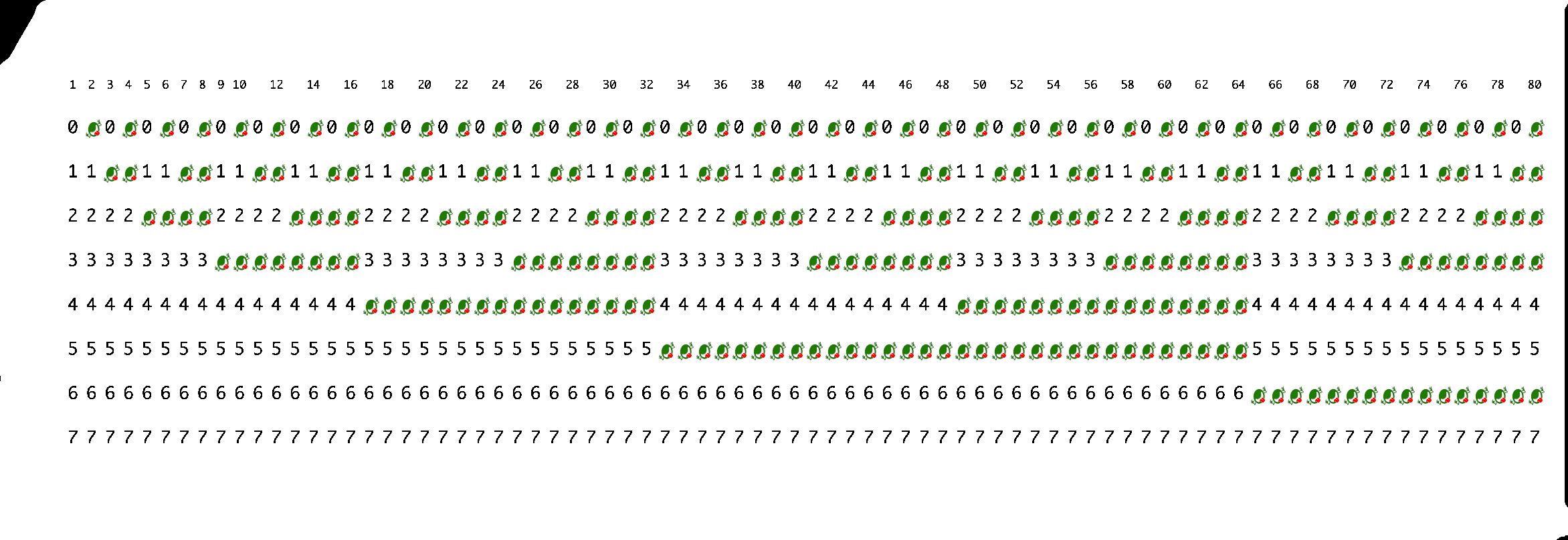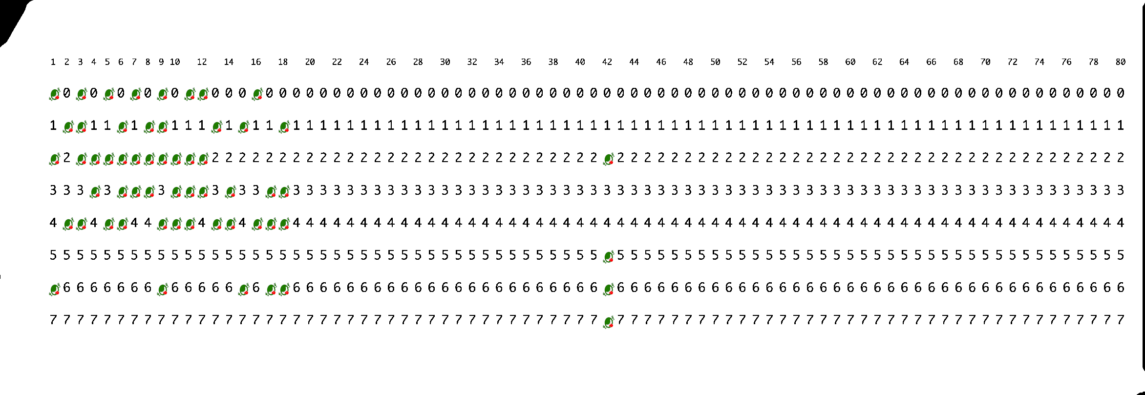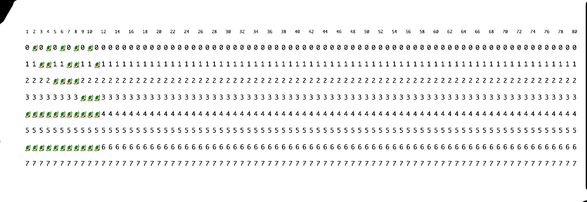 Chacune des autres cartes de l'archive disponible au téléchargement correspond à une ligne de code écrite en langage C, terminée par un caractère newline ` ', et dont les caractères sont encodés dans l'ordre à partir de la colonne 1. Par exemple, la carte suivante encode la ligne :